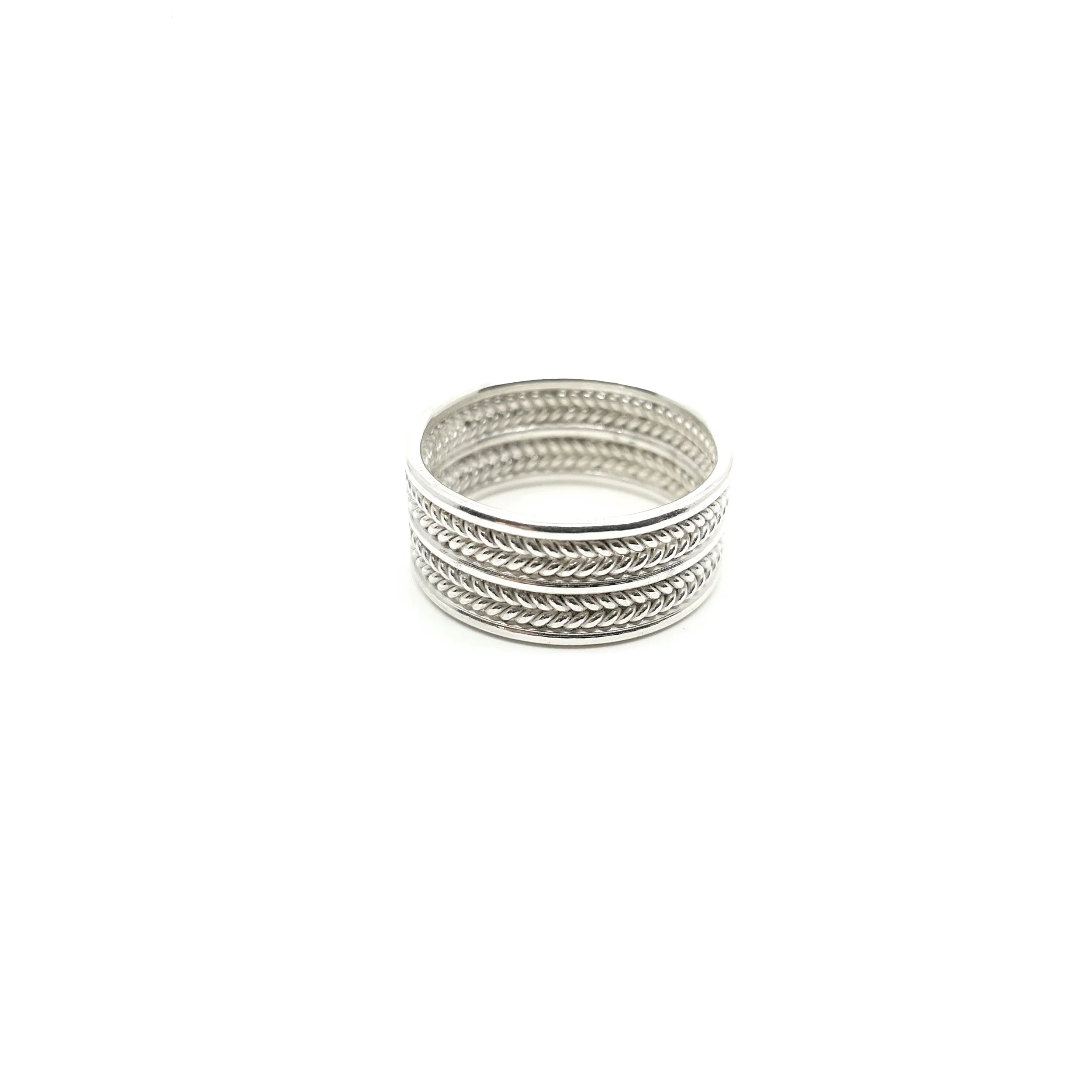 The band is shaped from a rhythm of smooth round silver and textured herringbone sections, arranged to create a strong linear pattern that flows around the finger. The wider proportions give the ring a sculptural character that suits anyone drawn to jewellery with a little more substance, without feeling heavy or uncomfortable to wear.