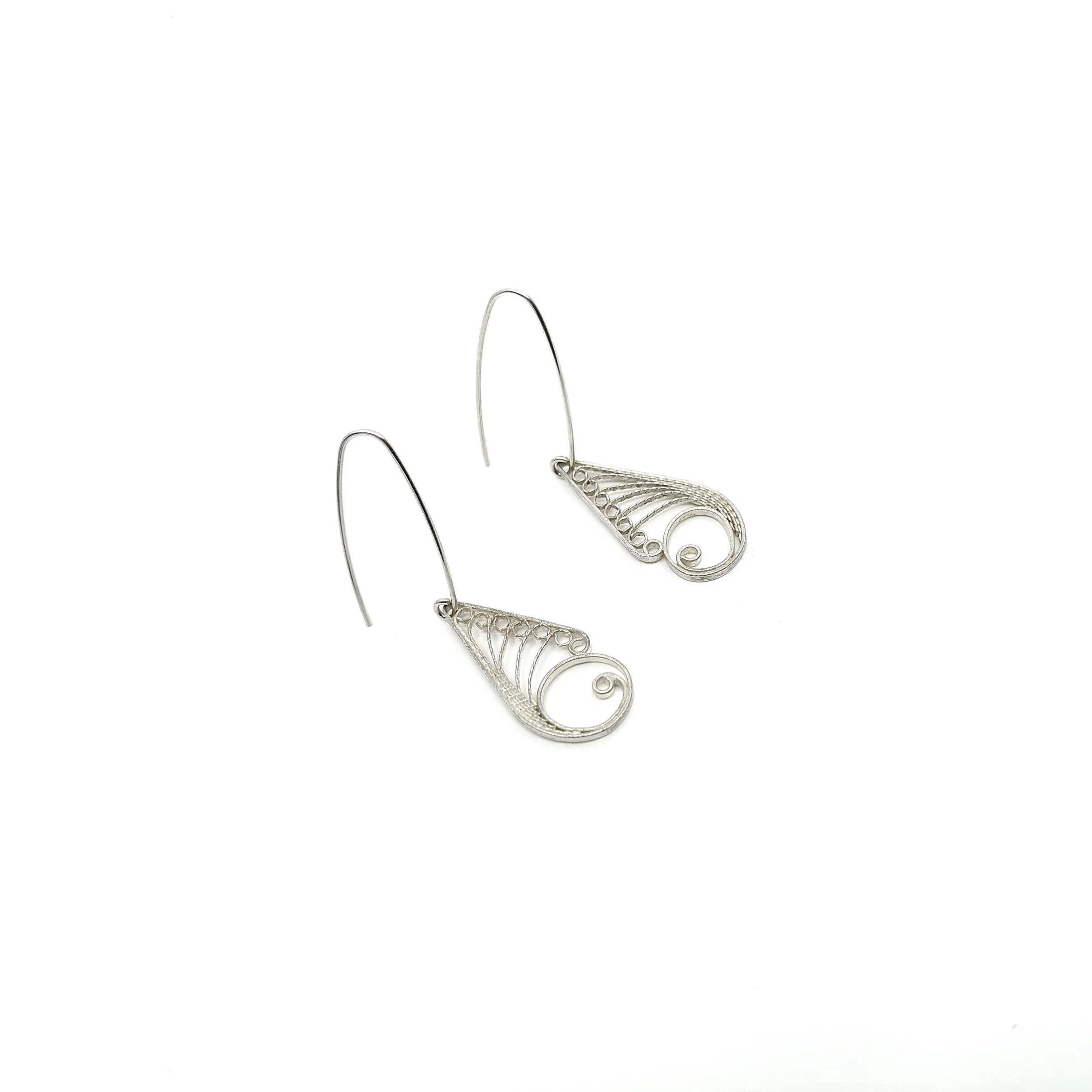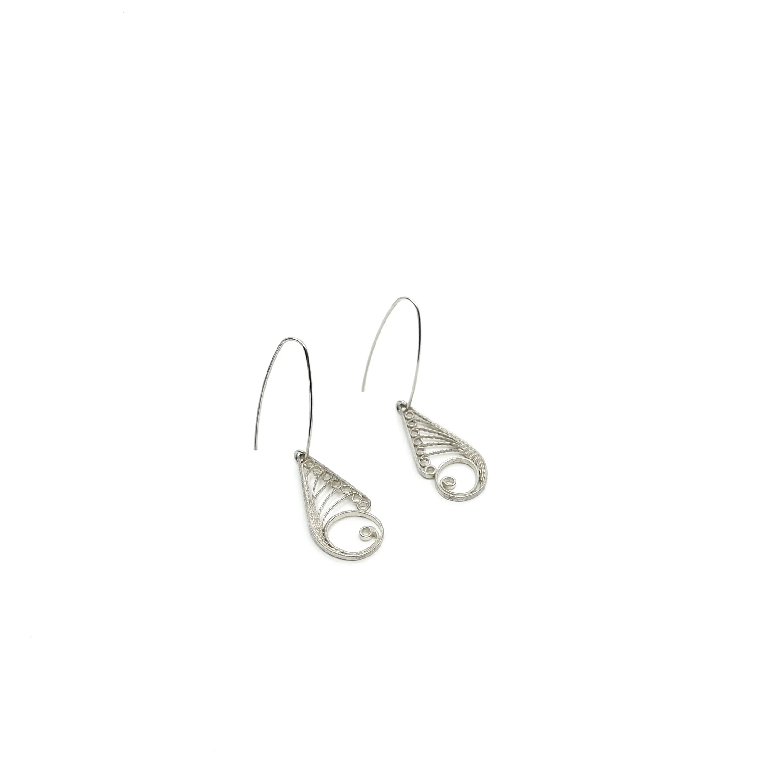 Handcrafted in sterling silver, the Herringbone Long Thin Earrings bring a slender, sculptural shape to the collection. Each earring is formed from a narrow herringbone section made by twisting the silver wires in opposite directions. A smooth central round wire runs up through the middle of the herringbone and continues down the back of the piece to form the hook, creating a clean uninterrupted line from top to bottom.